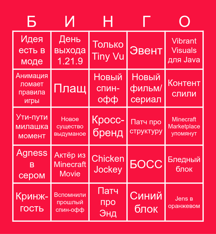 This bingo card has a free space and 24 words: Кринж- гость, Актёр из Minecraft Movie, Новый спин-офф, Синий блок, Vibrant Visuals для Java, Идея есть в моде, День выхода 1.21.9, Только Tiny Vu, Патч про структуру, Minecraft Marketplace упомянут, Ути-пути милашка момент, Плащ, БОСС, Бледный блок, Анимация ломает правила игры, Вспомнили прошлый спин-офф, Патч про Энд, Эвент, Контент слили, Agness в сером, Новое существо выдуманоe, Chicken Jockey, Новый фильм/сериал and Jens в оранжевом.