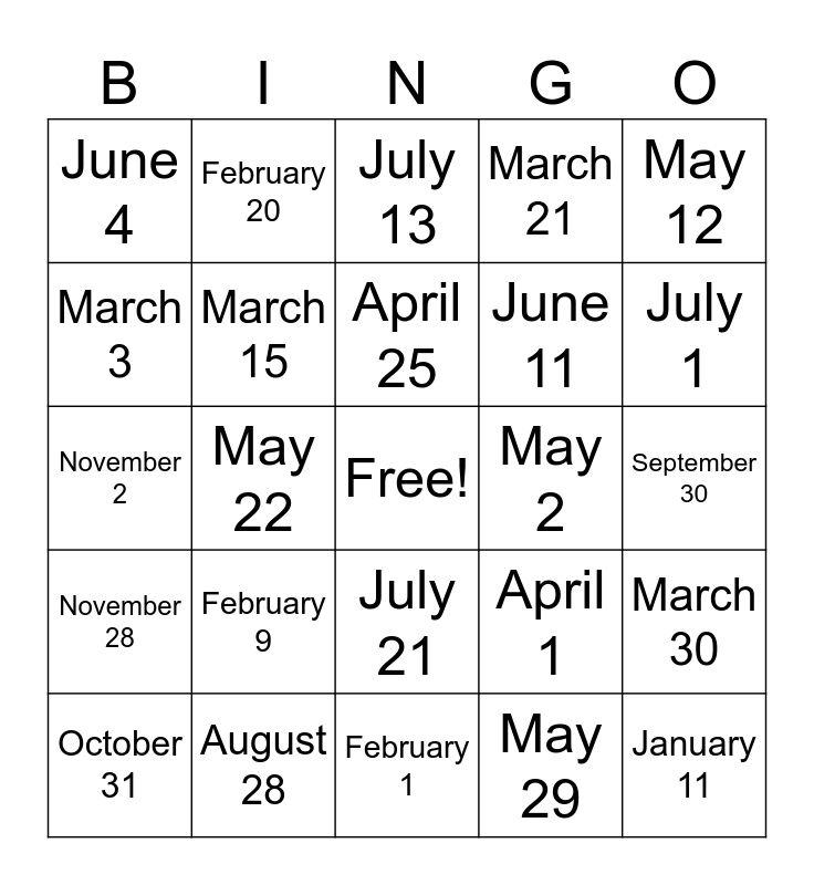 This bingo card has a free space and 50 words: January 2, January 11, January 24, February 1, February 9, February 14, February 20, February 28, March 3, March 8, March 15, March 21, March 30, April 1, April 10, April 18, April 25, May 2, May 5, May 12, May 22, May 29, June 4, June 11, June 19, June 27, July 1, July 4, July 13, July 21, July 30, August 6, August 12, August 20, August 28, September 3, September 9, September 15, September 22, September 30, October 5, October 12, October 19, October 25, October 31, November 2, November 11, November 18, November 28 and December 25.