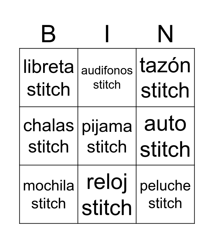 This bingo card has a free space and 23 words: polera stitch, polerón stitch, reloj stitch, toalla stitch, peluche stitch, libreta stitch, auto stitch, audifonos stitch, calcetines stitch, pantufla stitch, lápices stitch, pistola de burbujas de stitch, figura stitch escritorio, botella stitch, short stitch, lonchera stitch, tazón stitch, estuche stitch, mochila stitch, jockey stitch, chalas stitch, higiene stitch and perfume stitch.