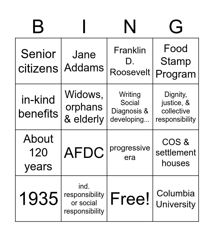 This bingo card has 17 words: Free!, 1935, Franklin D. Roosevelt, Senior citizens, AFDC, Food Stamp Program, COS & settlement houses, Writing Social Diagnosis & developing..., Dignity, justice, & collective responsibility, Widows, orphans & elderly, ind. responsibility or social responsibility, progressive era, in-kind benefits, Jane Addams, About 120 years, Help only in emergencies and Columbia University.