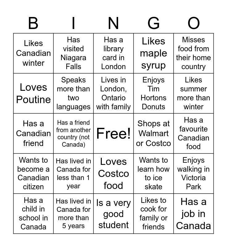 This bingo card has a free space and 24 words: Has lived in Canada for less than 1 year, Has lived in Canada for more than 5 years, Lives in London, Ontario with family, Has a child in school in Canada, Misses food from their home country, Likes Canadian winter, Loves Poutine, Has visited Niagara Falls, Shops at Walmart or Costco, Loves Costco food, Enjoys Tim Hortons Donuts, Has a Canadian friend, Wants to learn how to ice skate, Enjoys walking in Victoria Park, Speaks more than two languages, Likes to cook for family or friends, Has a favourite Canadian food, Has a library card in London, Likes summer more than winter, Has a friend from another country (not Canada), Has a job in Canada, Wants to become a Canadian citizen, Likes maple syrup and Is a very good student.