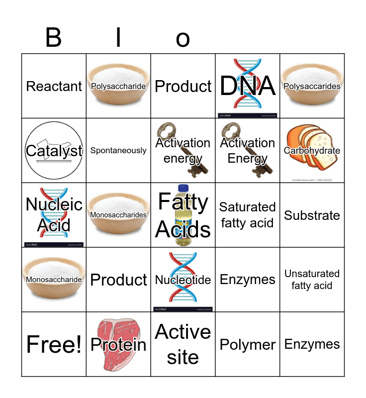 This bingo card has 15 images and 27 words: Enzymes, Enzymes, Activation Energy, Active site, Catalyst, Product, Polysaccharide, Monosaccharide, Saturated fatty acid, Unsaturated fatty acid, Nucleic Acid, DNA, Free!, Protein, Carbohydrate, Lipid, Spontaneously, Activation energy, Product, Reactant, Substrate, Polymer, Monosaccharides, Fatty Acids, Nucleotide, Polysaccarides and Fatty Acids.