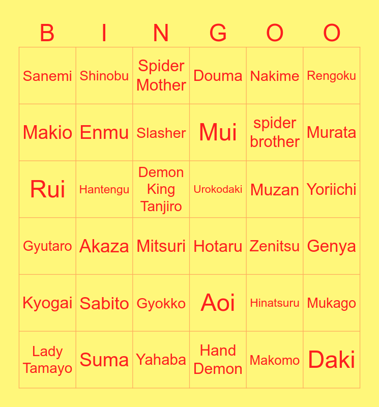 This bingo card has 48 words: Tanjiro, Rui, Nezuko, Zenitsu, Muzan, Aoi, Shinobu, Uzui, Rengoku, Suma, Makio, Douma, Akaza, Gyutaro, Daki, Gyokko, Enmu, Hantengu, Inosuke, Nakime, Murata, Genya, Sanemi, Slasher, Giyu, Mui, Mitsuri, Iguro, Yoriichi, Urokodaki, Susamaru, Sabito, Makomo, Gyomei, Hotaru, Yahaba, Hand Demon, Demon King Tanjiro, Lady Tamayo, Kanae, Hinatsuru, Kyogai, Spider Mother, Spider father, spider brother, spider sister, Mukago and Temple Demon.