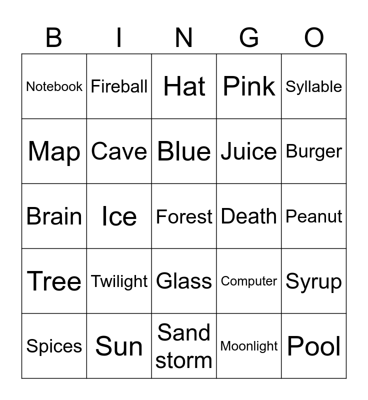 This bingo card has a free space and 24 words: Spices, Twilight, Blue, Moonlight, Syllable, Notebook, Fireball, Hat, Death, Peanut, Brain, Cave, Computer, Syrup, Map, Sun, Sand storm, Pink, Burger, Tree, Ice, Glass, Juice and Pool.