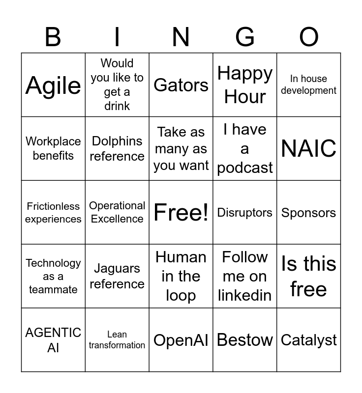 This bingo card has a free space and 29 words: AGENTIC AI, Velocity, Operational Excellence, Customer Centricity, Agile, Gators, Dolphins reference, Jaguars reference, Disruptors, Lean transformation, Sponsors, Catalyst, OpenAI, Bestow, NAIC, Acceleration, Human in the loop, Technology as a teammate, In house development, Frictionless experiences, Follow me on linkedin, Underinsured, I have a podcast, Workplace benefits, Happy Hour, Would you like to get a drink, Is this free, Take as many as you want and Come by our booth.