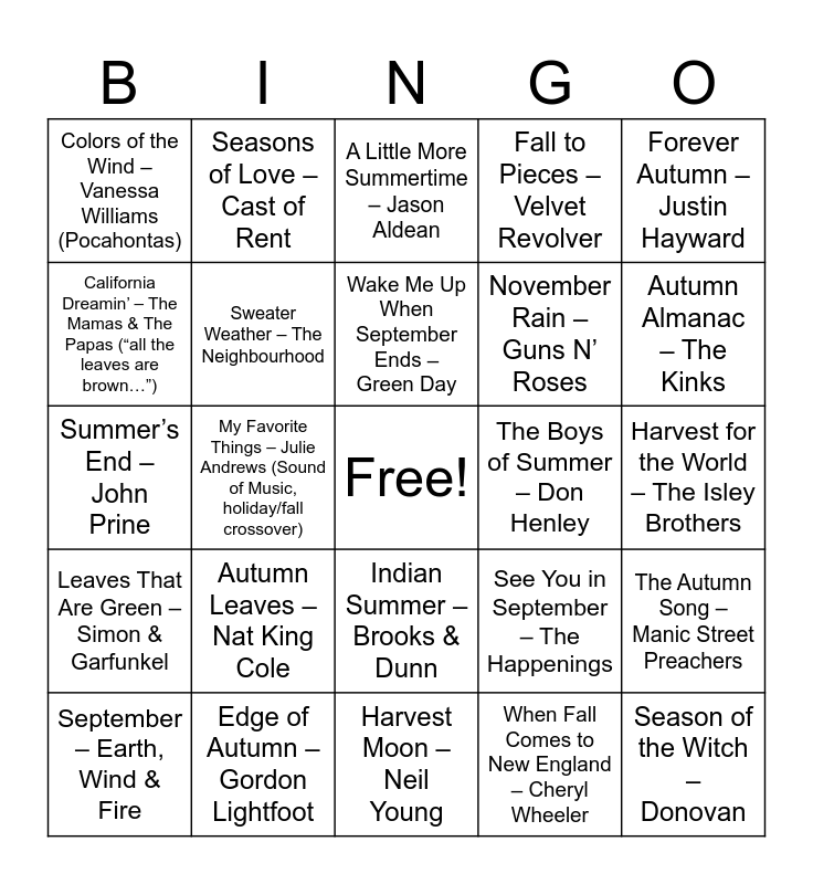 This bingo card has a free space and 25 words: Autumn Leaves – Nat King Cole, Harvest Moon – Neil Young, Wake Me Up When September Ends – Green Day, September – Earth, Wind & Fire, Forever Autumn – Justin Hayward, Colors of the Wind – Vanessa Williams (Pocahontas), California Dreamin’ – The Mamas & The Papas (“all the leaves are brown…”), Seasons of Love – Cast of Rent, The Boys of Summer – Don Henley, Indian Summer – Brooks & Dunn, November Rain – Guns N’ Roses, Summer’s End – John Prine, See You in September – The Happenings, The Autumn Song – Manic Street Preachers, Sweater Weather – The Neighbourhood, Fallin’ – Alicia Keys, Harvest for the World – The Isley Brothers, A Little More Summertime – Jason Aldean, Autumn Almanac – The Kinks, My Favorite Things – Julie Andrews (Sound of Music, holiday/fall crossover), Season of the Witch – Donovan, Edge of Autumn – Gordon Lightfoot, Leaves That Are Green – Simon & Garfunkel, Fall to Pieces – Velvet Revolver and When Fall Comes to New England – Cheryl Wheeler.