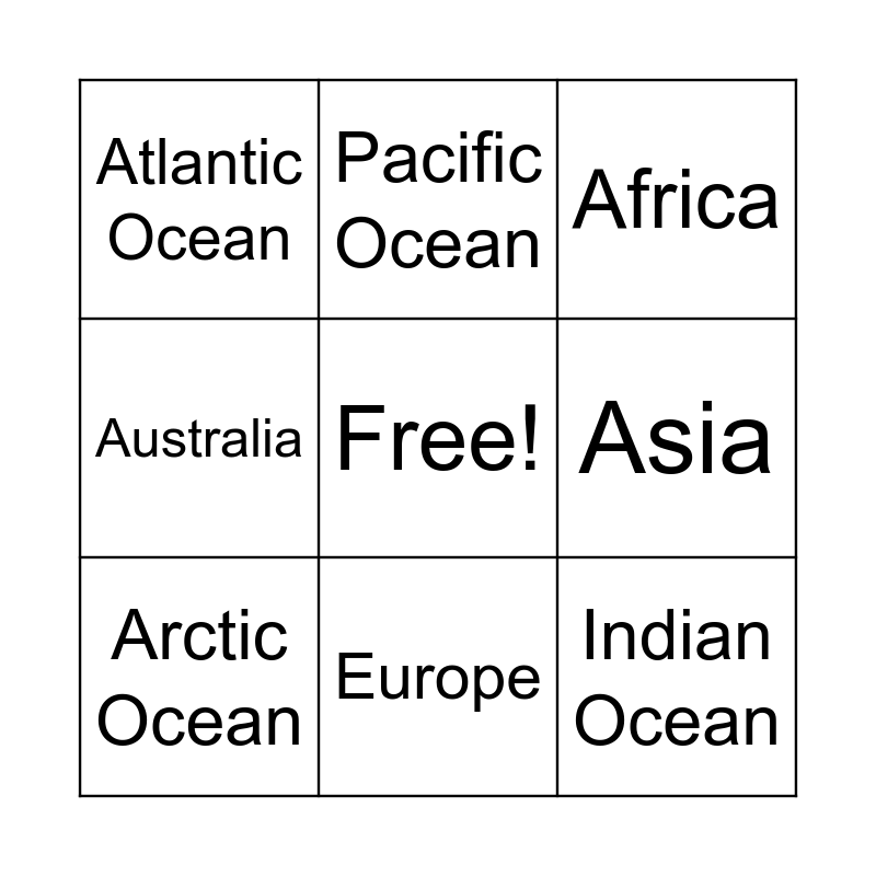 This bingo card has a free space and 11 words: North America, Europe, Indian Ocean, Arctic Ocean, Pacific Ocean, Africa, Asia, South America, Australia, Atlantic Ocean and Southern Ocean.