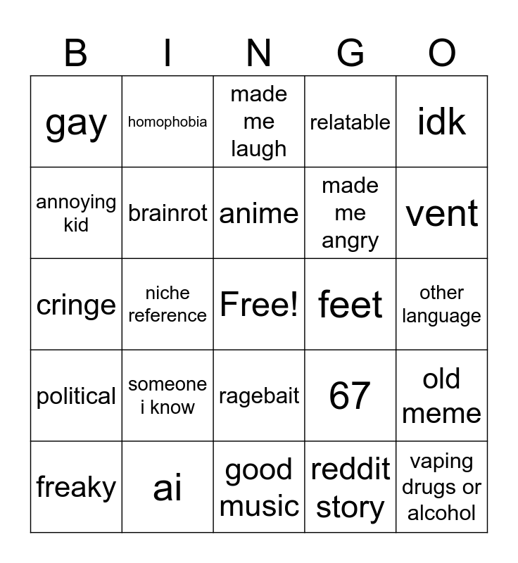 This bingo card has a free space and 24 words: someone i know, ai, anime, freaky, idk, gay, annoying kid, homophobia, feet, ragebait, made me angry, cringe, 67, old meme, brainrot, reddit story, other language, made me laugh, vent, niche reference, vaping drugs or alcohol, political, relatable and good music.