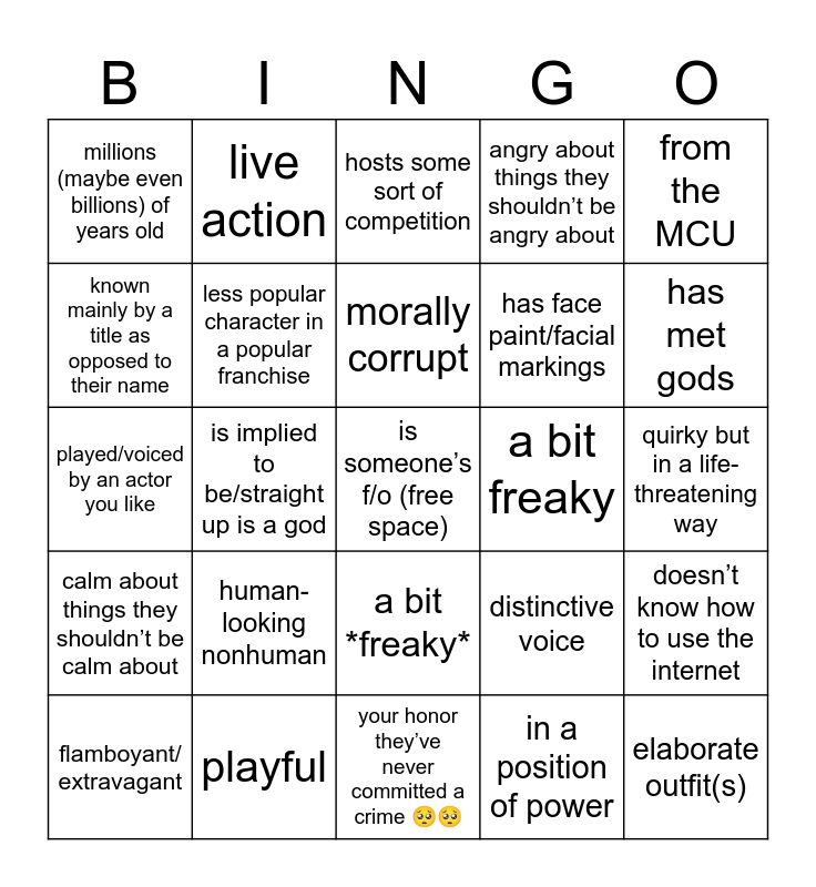 This bingo card has a free space and 24 words: human-looking nonhuman, playful, morally corrupt, flamboyant/ extravagant, from the MCU, millions (maybe even billions) of years old, known mainly by a title as opposed to their name, live action, a bit freaky, a bit *freaky*, has face paint/facial markings, played/voiced by an actor you like, distinctive voice, doesn’t know how to use the internet, less popular character in a popular franchise, in a position of power, quirky but in a life- threatening way, hosts some sort of competition, has met gods, is implied to be/straight up is a god, elaborate outfit(s), calm about things they shouldn’t be calm about, angry about things they shouldn’t be angry about and your honor they’ve never committed a crime 🥺🥺.