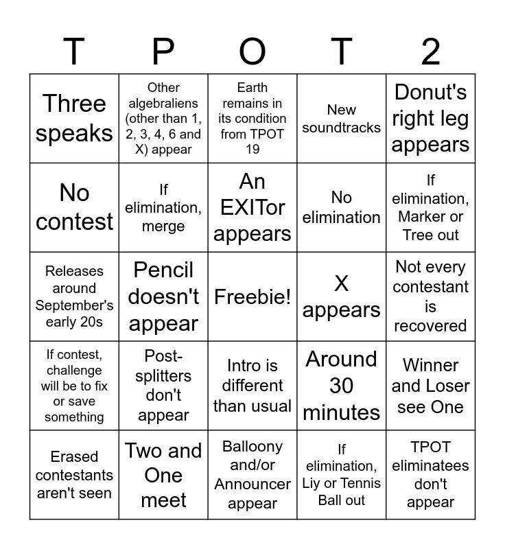 This bingo card has a free space and 24 words: Post-splitters don't appear, Two and One meet, An EXITor appears, Erased contestants aren't seen, Donut's right leg appears, Three speaks, No contest, Other algebraliens (other than 1, 2, 3, 4, 6 and X) appear, X appears, Intro is different than usual, No elimination, Releases around September's early 20s, Around 30 minutes, Winner and Loser see One, If elimination, merge, If elimination, Liy or Tennis Ball out, Not every contestant is recovered, Earth remains in its condition from TPOT 19, If elimination, Marker or Tree out, Pencil doesn't appear, TPOT eliminatees don't appear, If contest, challenge will be to fix or save something, New soundtracks and Balloony and/or Announcer appear.
