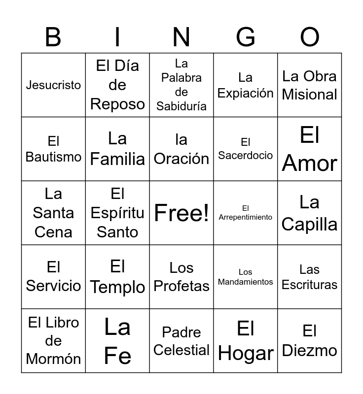 This bingo card has a free space and 24 words: El Templo, La Fe, la Oración, El Libro de Mormón, La Obra Misional, Jesucristo, El Bautismo, El Día de Reposo, El Arrepentimiento, Los Profetas, El Sacerdocio, La Santa Cena, Los Mandamientos, Las Escrituras, La Familia, El Hogar, La Capilla, La Palabra de Sabiduría, El Amor, El Espíritu Santo, El Diezmo, El Servicio, La Expiación and Padre Celestial.