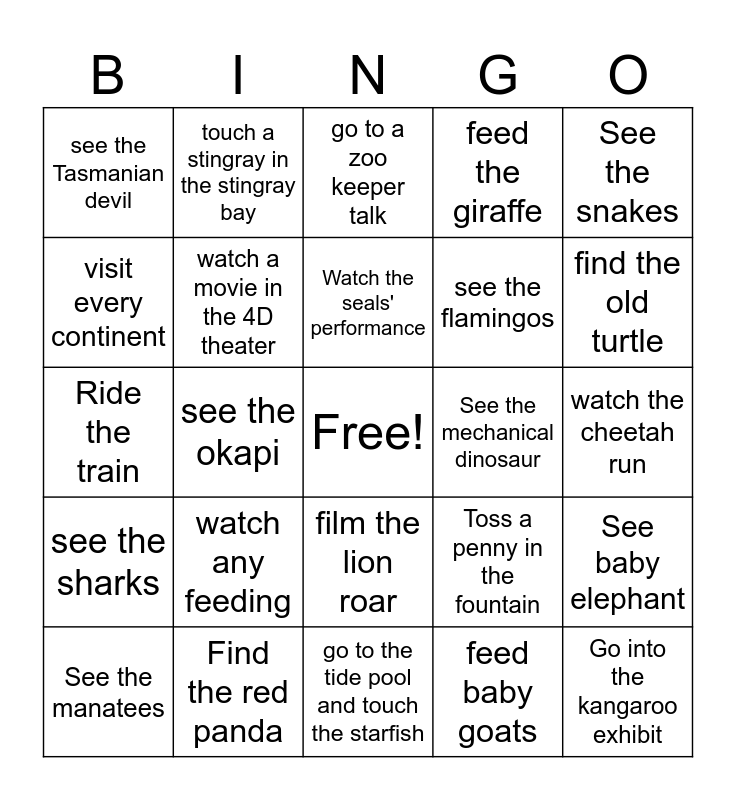 This bingo card has a free space and 24 words: See the manatees, watch any feeding, Watch the seals' performance, feed baby goats, See the snakes, see the Tasmanian devil, touch a stingray in the stingray bay, go to a zoo keeper talk, See the mechanical dinosaur, watch the cheetah run, Ride the train, watch a movie in the 4D theater, Toss a penny in the fountain, See baby elephant, visit every continent, Find the red panda, go to the tide pool and touch the starfish, feed the giraffe, find the old turtle, see the sharks, see the okapi, film the lion roar, see the flamingos and Go into the kangaroo exhibit.