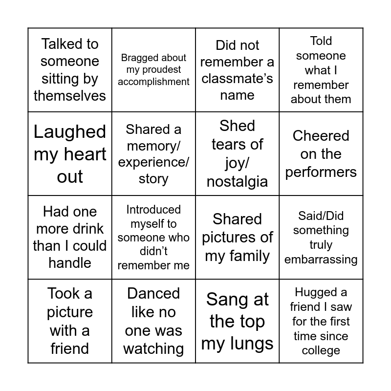 This bingo card has 16 words: Danced like no one was watching, Said/Did something truly embarrassing, Did not remember a classmate’s name, Talked to someone sitting by themselves, Had one more drink than I could handle, Bragged about my proudest accomplishment, Shared pictures of my family, Sang at the top my lungs, Laughed my heart out, Shared a memory/ experience/ story, Took a picture with a friend, Told someone what I remember about them, Introduced myself to someone who didn’t remember me, Cheered on the performers, Shed tears of joy/ nostalgia and Hugged a friend I saw for the first time since college.