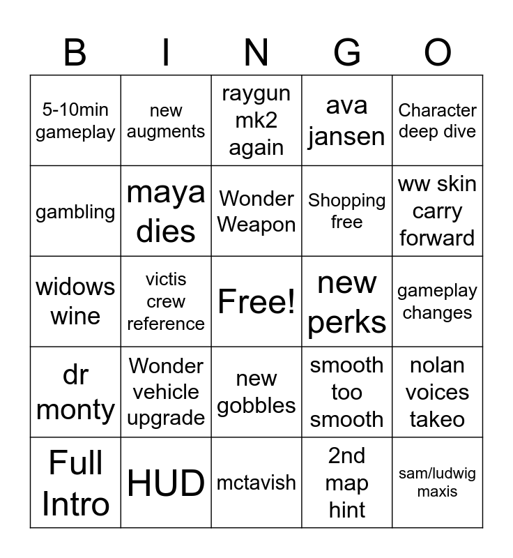 This bingo card has a free space and 24 words: Wonder vehicle upgrade, HUD, Wonder Weapon, Full Intro, Character deep dive, 5-10min gameplay, gambling, new augments, new perks, new gobbles, Shopping free, widows wine, smooth too smooth, nolan voices takeo, maya dies, 2nd map hint, gameplay changes, raygun mk2 again, ww skin carry forward, victis crew reference, sam/ludwig maxis, dr monty, ava jansen and mctavish.