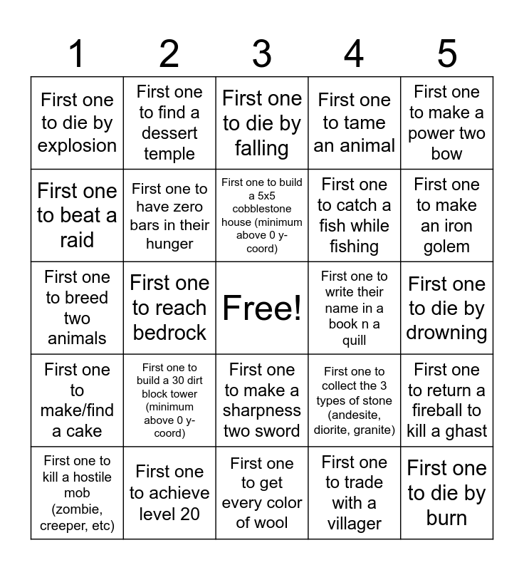 This bingo card has a free space and 24 words: First one to build a 30 dirt block tower (minimum above 0 y-coord), First one to achieve level 20, First one to build a 5x5 cobblestone house (minimum above 0 y-coord), First one to kill a hostile mob (zombie, creeper, etc), First one to make a power two bow, First one to die by explosion, First one to beat a raid, First one to find a dessert temple, First one to write their name in a book n a quill, First one to make a sharpness two sword, First one to catch a fish while fishing, First one to breed two animals, First one to collect the 3 types of stone (andesite, diorite, granite), First one to return a fireball to kill a ghast, First one to have zero bars in their hunger, First one to trade with a villager, First one to die by drowning, First one to die by falling, First one to make an iron golem, First one to reach bedrock, First one to die by burn, First one to make/find a cake, First one to tame an animal and First one to get every color of wool.