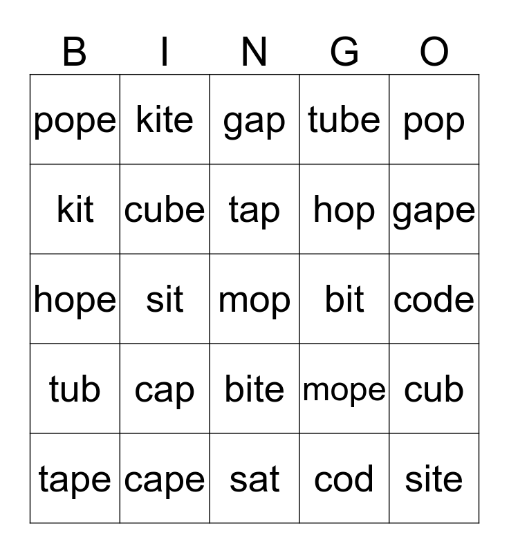 This bingo card has a free space and 24 words: cap, cape, tap, tape, pop, pope, kit, kite, bit, bite, hop, hope, mope, cub, cube, cod, code, gap, gape, sit, site, tub, tube and sat.