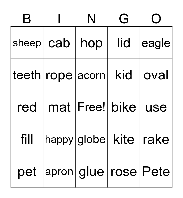 This bingo card has a free space and 29 words: pet, tape, mat, ice, sheep, hop, rope, happy, bike, apron, use, Pete, glue, rose, oval, tie, globe, fill, eagle, red, kite, unicorn, kid, teeth, lid, cab, rake, acorn and cube.