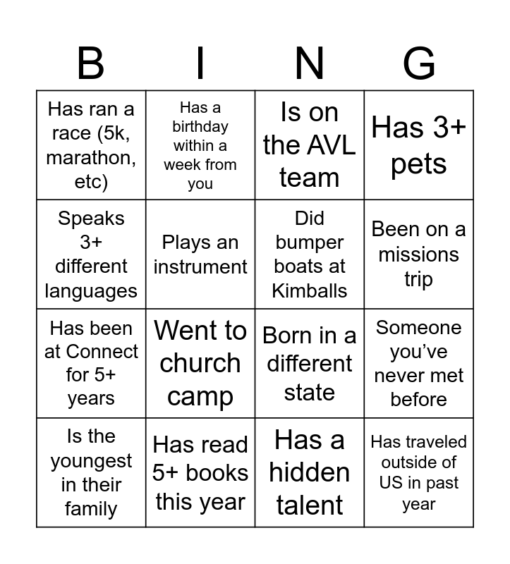 This bingo card has 16 words: Has read 5+ books this year, Someone you’ve never met before, Is on the AVL team, Has ran a race (5k, marathon, etc), Has been at Connect for 5+ years, Has a birthday within a week from you, Born in a different state, Has a hidden talent, Speaks 3+ different languages, Plays an instrument, Is the youngest in their family, Has 3+ pets, Went to church camp, Been on a missions trip, Did bumper boats at Kimballs and Has traveled outside of US in past year.