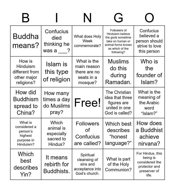 This bingo card has a free space and 27 words: Which best describes “honest language?”, What are Messengers of Jesus’s teachings called?, Muslims do this during Ramadan., Spiritual cleansing of sins and acceptance into God’s church., How is Hinduism different from other major religions?, What does Holy Week commemorate?, Confucius died thinking he was a ___?, What is considered a person’s highest purpose in Hinduism?, The Christian idea that three figures are united in one God is called?, How does a Buddhist achieve nirvana?, How did Buddhism spread to China?, Followers of Hinduism believe the gods sometime take on human or animal forms known as which of the following?, Which best describes Yin?, It means rebirth for Buddhists., Who is the founder of Islam?, A three-month retreat during the rainy season where Buddhists live like monks., Islam is this type of religion, What is the main reason there are no seats in a mosque?, Which animal is especially sacred to Hindus?, Buddha means?, What is the meaning of the Arabic word “Islam?”, What is part of the Holy Communion?, How many times a day do Muslims pray?, For Hindus, this being is considered the protector and preserver of life., Followers of Confucius are called?, Confucius believed a person should strive to love this person and Ancient body of sacred Hindu writings..