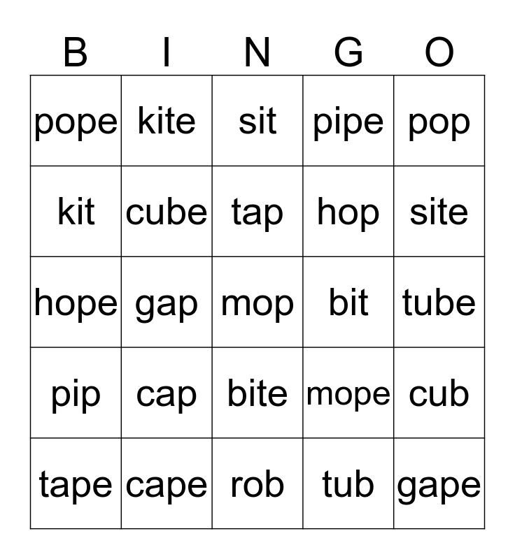 This bingo card has a free space and 24 words: cap, cape, tap, tape, pop, pope, kit, kite, bit, bite, hop, hope, mope, cub, cube, tub, tube, sit, site, gap, gape, pip, pipe and rob.