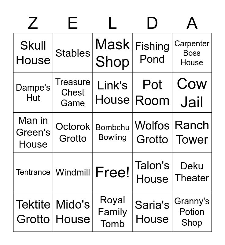 This bingo card has 26 words: Free!, Saria's House, Link's House, Mido's House, Carpenter Boss House, Skull House, Dampe's Hut, Stables, Ranch Tower, Talon's House, Pot Room, Man in Green's House, Deku Theater, Tektite Grotto, Octorok Grotto, Lake Hylia Lab, Fishing Pond, Tentrance, Mask Shop, Bombchu Bowling, Cow Jail, Royal Family Tomb, Wolfos Grotto, Windmill, Treasure Chest Game and Granny's Potion Shop.