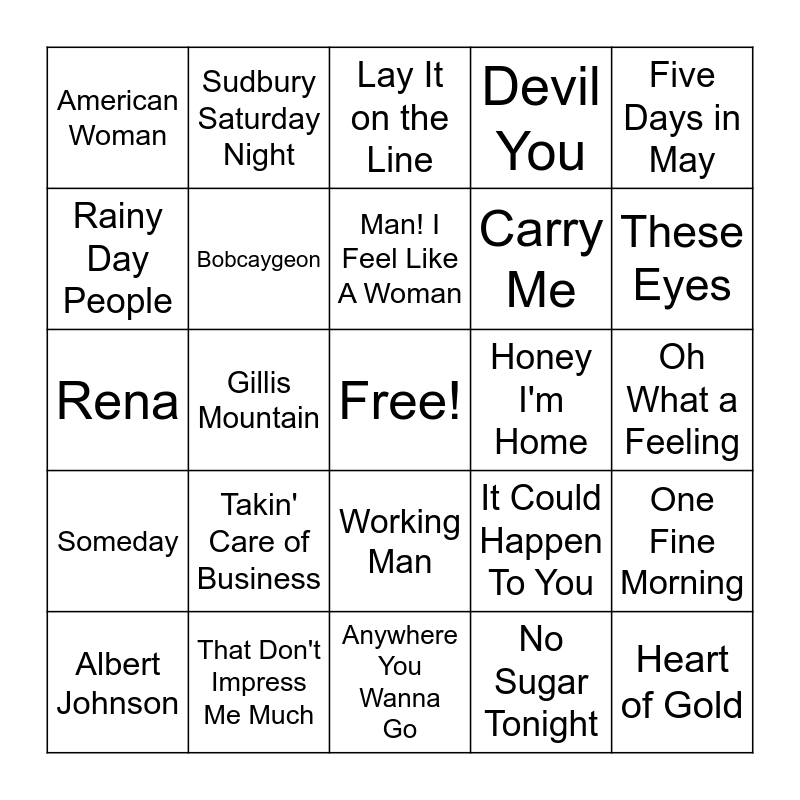 This bingo card has a free space and 55 words: A Little Good News, Albert Johnson, All I Wanna Do Is Play Cards, American Woman, Anywhere You Wanna Go, Bad Timing, Bobcaygeon, Canadian Railroad Trilogy, Carry Me, Closer To The Heart, Devil You, Don't Forget Me, Early Morning Rain, Enid, Fare Thee Well Love, Fifty-Mission Cap, Five Days in May, Gillis Mountain, Good Mother, Heart of Gold, Honey I'm Home, If I Had $1000000, It Could Happen To You, Lay It on the Line, Love Can Move Mountains, Man! I Feel Like A Woman, No Sugar Tonight, North Country, Oh What a Feeling, One Fine Morning, Orangedale Whistle, Ordinary Day, Painted Ladies, Pretty Lady, Rainy Day People, Rena, Snowbird, Someday, Sometimes When We Touch, Stand Tall, Sudbury Saturday Night, Sunglasses at Night, Sunny Days, Sweet City Woman, Takin' Care of Business, That Don't Impress Me Much, The Hockey Song, The Truck Got Stuck, The Wreck of the Edmund Fitzgerald, These Eyes, Wasn't That a Party?, We're here for a Good Time, Wild Eyes, Working Man and You Ain't Seen Nothing Yet.