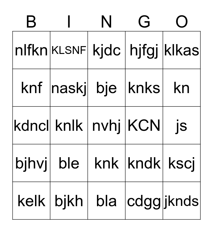 This bingo card has 25 words: ble, bla, bje, kelk, klkas, nlfkn, knf, KLSNF, KCN, knk, knks, kdncl, kndk, kscj, naskj, jknds, js, kjdc, kn, knlk, nvhj, bjkh, bjhvj, hjfgj and cdgg.