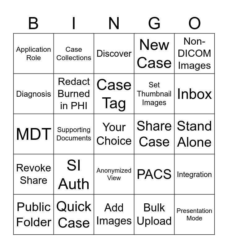 This bingo card has a free space and 24 words: SI Auth, Quick Case, Case Tag, Public Folder, Non-DICOM Images, Application Role, Diagnosis, Case Collections, Share Case, Anonymized View, Set Thumbnail Images, MDT, PACS, Integration, Redact Burned in PHI, Bulk Upload, Stand Alone, Discover, Inbox, Supporting Documents, Presentation Mode, Revoke Share, New Case and Add Images.