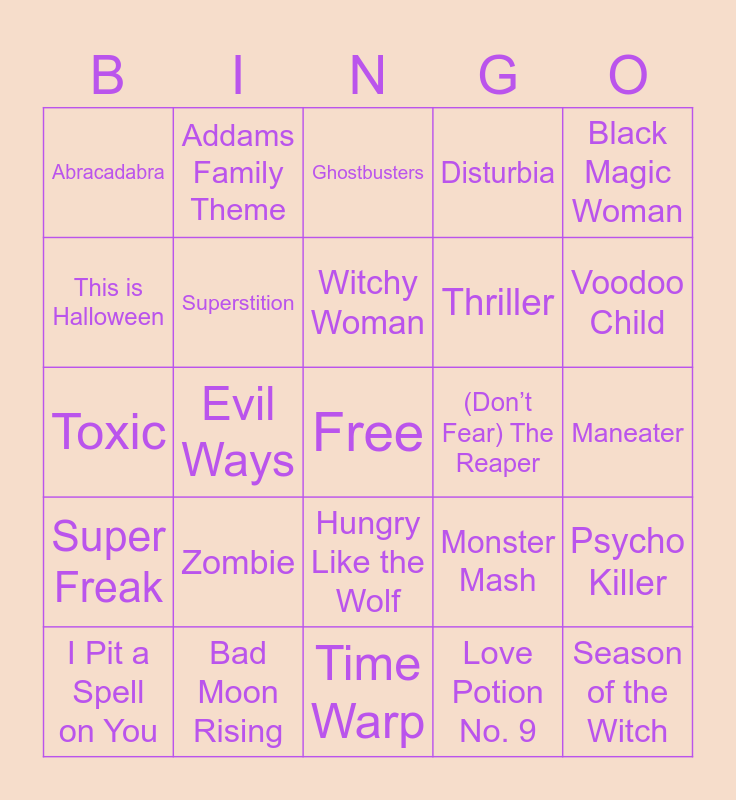 This bingo card has a free space and 27 words: Monster Mash, Somebody’s Watching Me, Thriller, Time Warp, This is Halloween, Ghostbusters, Addams Family Theme, Super Freak, (Don’t Fear) The Reaper, Psycho Killer, Toxic, Disturbia, I Pit a Spell on You, Bad Moon Rising, Voodoo Child, Werewolves of London, Superstition, Witchy Woman, Zombie, Abracadabra, Maneater, Love Potion No. 9, Evil Ways, Season of the Witch, Hungry Like the Wolf, Black Magic Woman and Goosebumps Theme.