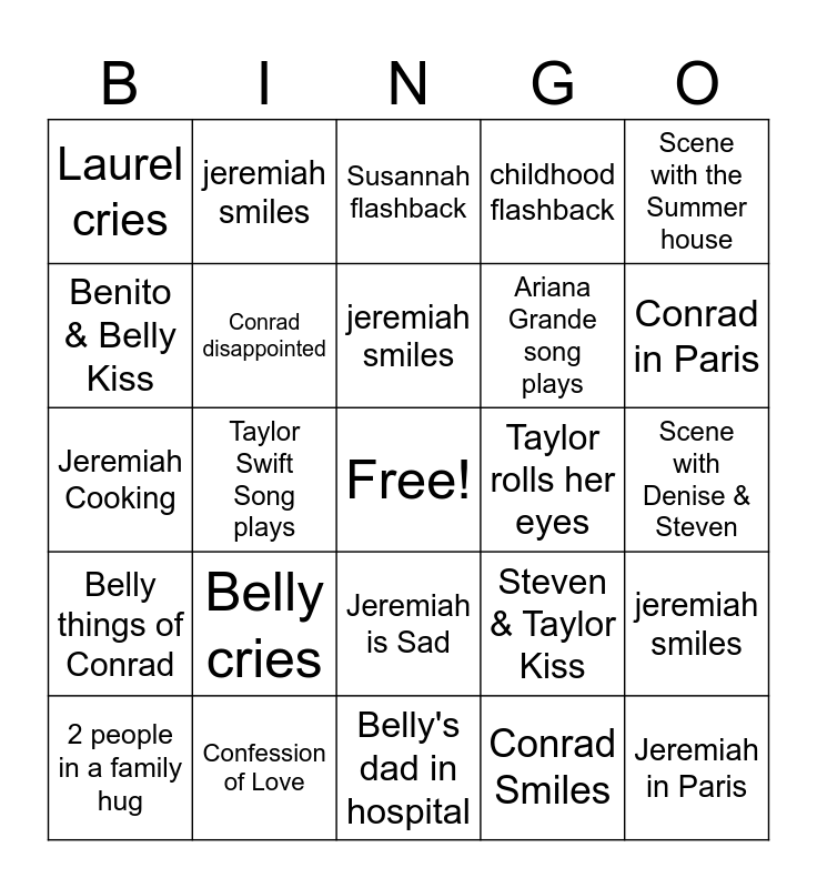 This bingo card has a free space and 29 words: 2 people in a family hug, Belly speaks French, Taylor Swift Song plays, Belly is mad, Laurel cries, Susannah flashback, Conrad disappointed, Belly cries, Taylor rolls her eyes, Confession of Love, Scene with Denise & Steven, Jeremiah in Paris, Belly's dad in hospital, Conrad Smiles, Conrad in Paris, Jeremiah & Belly hug, Jeremiah is Sad, Belly things of Conrad, Scene with the Summer house, Jeremiah Cooking, Steven & Taylor Kiss, Conrad & Belly reunite, Ariana Grande song plays, Benito & Belly Kiss, childhood flashback, jeremiah smiles, jeremiah smiles, jeremiah smiles and jeremiah smiles.