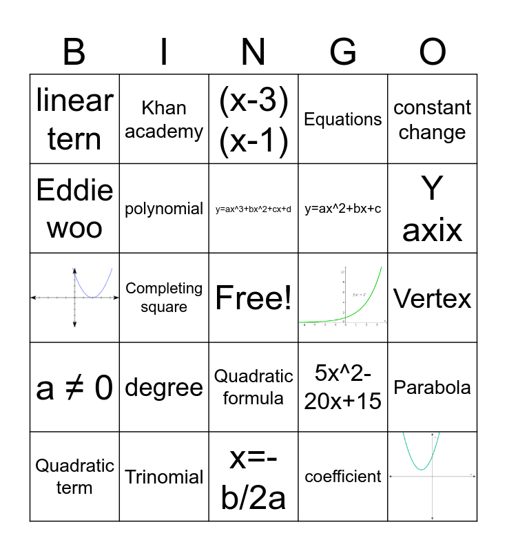 This bingo card has 5 images, a free space and 24 words: Trinomial, (x-3)(x-1), constant change, linear tern, polynomial, y=ax^3+bx^2+cx+d, Parabola, Quadratic term, Completing square, coefficient, X axis, x=-b/2a, 5x^2-20x+15, Y axix, a ≠ 0, degree, Leading term, y=ax^2+bx+c, Vertex, Eddie woo, Khan academy, Quadratic formula, Equations and Graphs.