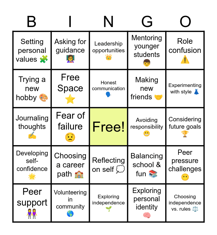 This bingo card has a free space and 25 words: Choosing a career path 🏫, Exploring independence 🌱, Honest communication 🗣, Peer support 👭, Role confusion ⚠️, Setting personal values 🧩, Trying a new hobby 🎨, Asking for guidance 👩🏫, Avoiding responsibility 😬, Reflecting on self 💭, Making new friends 🤝, Journaling thoughts ✍️, Balancing school & fun 📚, Peer pressure challenges 😶, Free Space ⭐, Discussing feelings with parents ❤️, Considering future goals 🏆, Leadership opportunities 👑, Experimenting with style 👗, Fear of failure 😟, Choosing independence vs. rules ⚖️, Volunteering in community 🌎, Developing self-confidence 🌟, Mentoring younger students 👦 and Exploring personal identity 🧠.