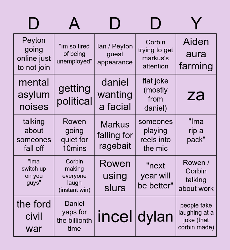 This bingo card has a free space and 69 words: "I got work in the morning or something", "Ima rip a pack", Daniel threatening own life or others, Ray makes another unfunny joke, Daniel yaps for the billionth time, Markus hating everyone in the server, Corbin trying to get markus's attention, Aiden playing a game no one else is playing, Aiden aura farming, Corbin or Aiden asking if theres another chat happening, Rowen / Corbin talking about work, markus getting disceplined by parents, Peyton going online just to not join, Ian / Peyton guest appearance, More than 5 people in call, Rowen going quiet for 10mins, Rowen using slurs, flat joke (mostly from daniel), genuine crashout (insect), "ima switch up on you guys", someones playing reels into the mic, "next year will be better", za, Ray calling shawna, Rowen leaving and hopping on rivals, Rowen and dylan joing at the same time, Corbin mansplaining anything, ragequit, dylan, "i have the hardest job ever", "im so tired of being unemployed", "my friends suck", car meet, "watch me play killer", sharing secrets, Ray and Markus sharing secrets, joining call just to not be in room / desk, Daniel swearing like a middle schooler, mental asylum noises, ego for no reason, Corbin making everyone laugh (instant win), people fake laughing at a joke (that corbin made), making up bs excuse to leave the call, parents chilling in room for too long, ford brothers hate, the ford civil war, getting personal with insults for no reason, aiden off a edible again, minecraft server mentioned, getting political, daniel wanting a facial, looking at other monitor to get approval like a good boy, 1/10 ragebait, incel, red pilled / women hate, dark humor, talking about prime daddy said no, aiden going out to eat, blake feature, talking about someones fall off, daniel is a fossil, daniel calling support from mom, peyton ex mention, non-verbal, voice crack of doom, tryna be like john, purple just to not get black ice, scrolling reels and goon talk.