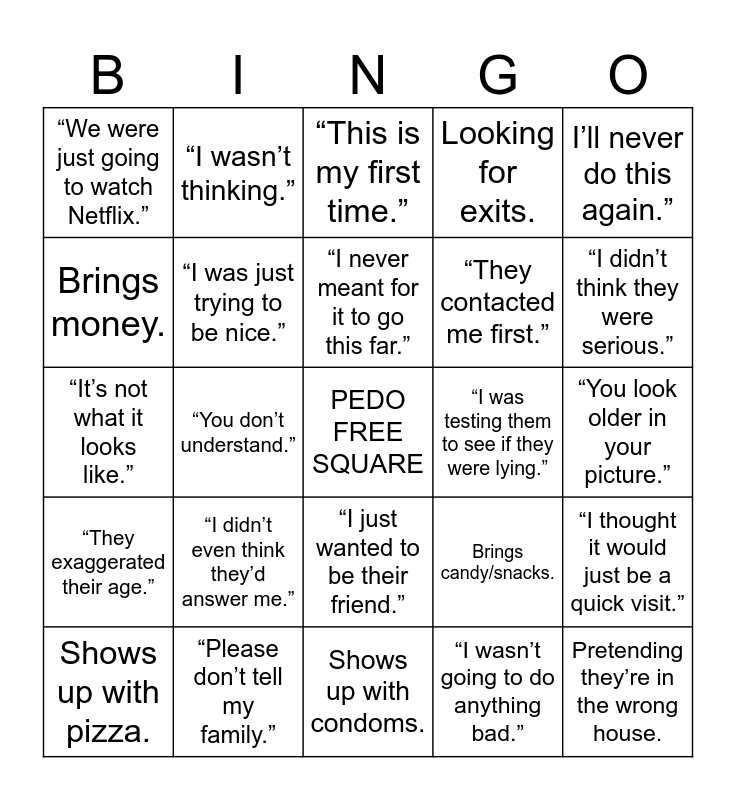 This bingo card has a free space and 85 words: “I was just here to hang out.”, “I wasn’t going to do anything.”, “This is my first time.”, “She told me she was 18.”, “I was just lonely.”, “Nothing was going to happen., “I was only joking online.”, “I came to talk, that’s it.”, “I didn’t even want to come.”, “I swear I wasn’t going to touch them.”, “I didn’t mean it like that.”, “I thought they were kidding about their age.”, “I was testing them to see if they were lying.”, “I didn’t think they were serious.”, “I didn’t plan anything.”, “I wasn’t thinking.”, “I just wanted to be their friend.”, “They contacted me first.”, “I came to warn them.”, Shows up with pizza., Shows up with alcohol., Shows up with condoms., Brings candy/snacks., Brings flowers., Brings money., Drives hours to get there. (2 hrs or more), Pretends to be lost., Walks around nervously., Asks, “Is anyone else here?”, “Please don’t call the cops.”, “Please don’t tell my family.”, “Can we delete the messages?”, “This was a mistake.”, I’ll never do this again.”, “It’s not what it looks like.”, “I didn’t know it was illegal.”, “I didn’t plan to stay long.”, “I can explain everything.”, “You look older in your picture.”, “We were just going to watch Netflix.”, “I thought they were ...", “I was just curious.”, “I just wanted to see if they were real.”, “I wasn’t serious in the chat.”, “They exaggerated their age.”, “I thought this was a setup.”, “Someone else was using my account.”, “I didn’t think I’d actually meet them.”, “I was just passing through.”, “I don’t usually do this.”, “I was just trying to be nice.”, “I never meant for it to go this far.”, “It got out of hand.”, Awkward silence., Nervous laugh., Sweating., Asking to use the bathroom., Looking for exits., Pretending they’re in the wrong house., Trying to leave quickly., Sitting in shock., Covering their face., Saying “ummm” a lot., “I’m a good person.”, “I’m not a bad guy.”, “You don’t understand.”, “It’s complicated.”, “I wasn’t going to do anything bad.”, “I thought we’d just chill.”, “I wasn’t sure they’d even show up.”, “I came here to stop them.”, “I’m not that type of person.”, “Am I free to leave?”, Starts making fun of the pedo, touching the decoy, “I was just trying to cheer them up.”, “We were just going to play video games.”, “I thought we’d hang out in public.”, “I wanted to make sure they weren’t talking to anyone else online.”, “They told me they were mature for their age.”, “I didn’t even think they’d answer me.”, “We were just going to grab some food.”, “I only came because I was bored.”, “I thought it would just be a quick visit.” and “I never thought I’d actually get caught.”.
