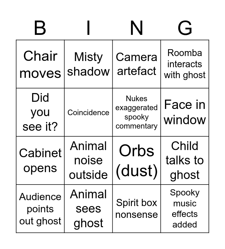 This bingo card has 16 words: Animal sees ghost, Child talks to ghost, Camera artefact, Chair moves, Cabinet opens, Misty shadow, Orbs (dust), Spirit box nonsense, Did you see it?, Coincidence, Audience points out ghost, Roomba interacts with ghost, Animal noise outside, Face in window, Nukes exaggerated spooky commentary and Spooky music effects added.