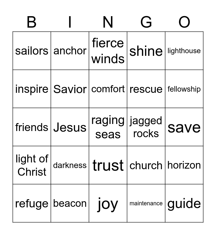 This bingo card has 62 words: Free!, beacon, candle, light of Christ, guide, safe harbor, Savior, burning brightly, rescue, safety, shine, welcoming, inspire, seacoast, ships, sailors, raging seas, lighthouse, warn, comfort, jagged rocks, fierce winds, refuge, maintenance, lost, vigilance, care, steady beam, horizon, lantern, protect, true light, reflection, light, save, anchor, divine light, Him, Jesus, lead, friends, fear, darkness, love, fellowship, church, prophet, temple, Holy Ghost, life, trust, joy, hope, peace, pray, learn, faith, teacher, The Way, Son of God, Good Shepherd and kindness.