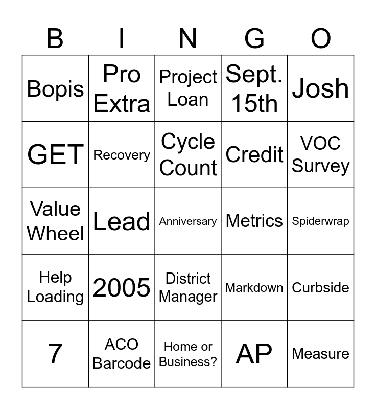 This bingo card has a free space and 24 words: 2005, ACO Barcode, Cycle Count, 7, Josh, Bopis, GET, Pro Extra, Metrics, District Manager, Credit, Value Wheel, Markdown, Curbside, Recovery, AP, Spiderwrap, Project Loan, VOC Survey, Lead, Measure, Help Loading, Sept. 15th and Home or Business?.