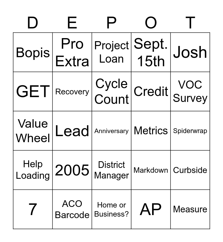 This bingo card has a free space and 24 words: 2005, ACO Barcode, Cycle Count, 7, Josh, Bopis, GET, Pro Extra, Metrics, District Manager, Credit, Value Wheel, Markdown, Curbside, Recovery, AP, Spiderwrap, Project Loan, VOC Survey, Lead, Measure, Help Loading, Sept. 15th and Home or Business?.