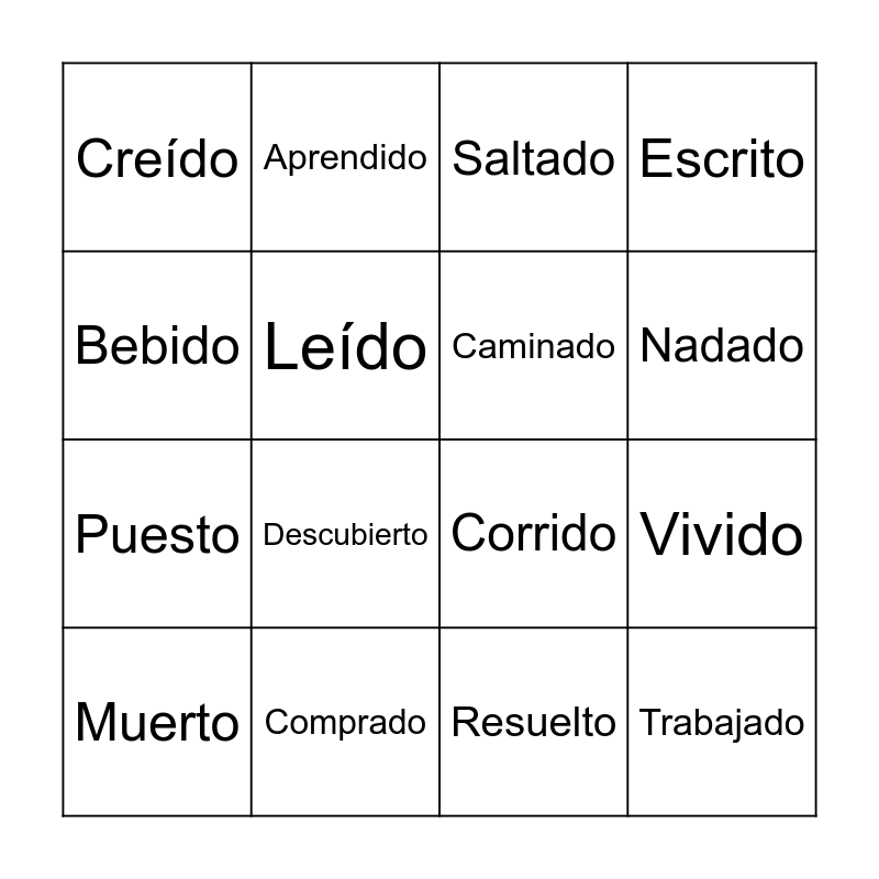 This bingo card has 32 words: Hablado, Comido, Vivido, Estudiado, Trabajado, Caminado, Bebido, Cantado, Aprendido, Escuchado, Nadado, Saltado, Cocinado, Limpiado, Comprado, Bailado, Preparado, Corrido, Hecho, Dicho, Roto, Visto, Resuelto, Abierto, Muerto, Escrito, Puesto, Leído, Creído, Caído, Vuelto and Descubierto.