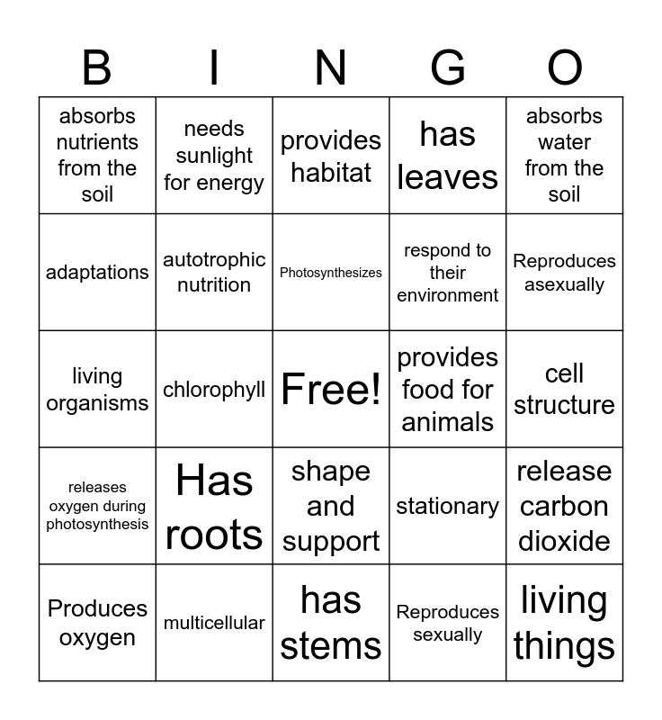 This bingo card has a free space and 24 words: Produces oxygen, Has roots, Photosynthesizes, Reproduces sexually, absorbs water from the soil, absorbs nutrients from the soil, needs sunlight for energy, provides habitat, provides food for animals, cell structure, living organisms, autotrophic nutrition, stationary, release carbon dioxide, adaptations, multicellular, has stems, has leaves, Reproduces asexually, releases oxygen during photosynthesis, chlorophyll, shape and support, respond to their environment and living things.