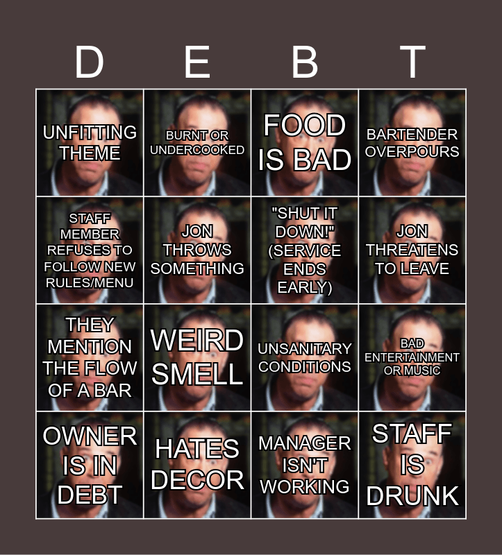 This bingo card has 16 images and 16 words: HATES DECOR, BAD ENTERTAINMENT OR MUSIC, FOOD IS BAD, UNFITTING THEME, THEY MENTION THE FLOW OF A BAR, BURNT OR UNDERCOOKED, UNSANITARY CONDITIONS, MANAGER ISN'T WORKING, STAFF MEMBER REFUSES TO FOLLOW NEW RULES/MENU, JON THROWS SOMETHING, OWNER IS IN DEBT, BARTENDER OVERPOURS, WEIRD SMELL, JON THREATENS TO LEAVE, "SHUT IT DOWN!" (SERVICE ENDS EARLY) and STAFF IS DRUNK.