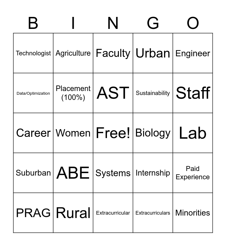 This bingo card has a free space and 25 words: ABE, Extracurricular, AST, PRAG, Engineer, Technologist, Data/Optimization, Agriculture, Biology, Systems, Sustainability, Career, Internship, Paid Experience, Placement (100%), Student-Centered, Lab, Faculty, Staff, Women, Minorities, Rural, Suburban, Urban and Extracurriculars.