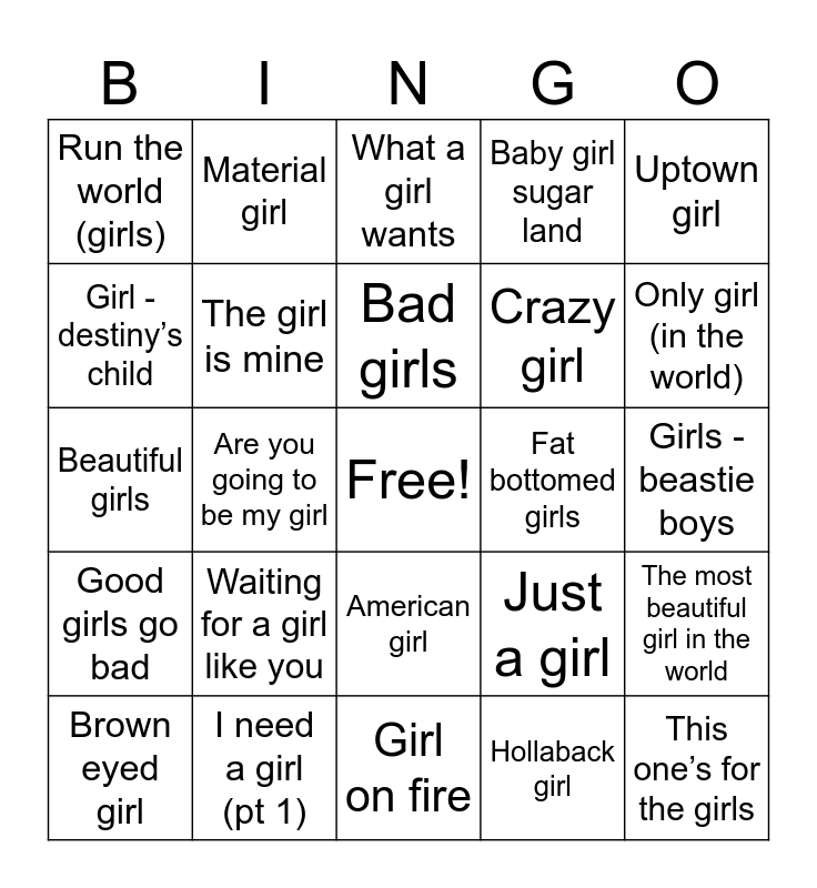 This bingo card has a free space and 25 words: Waiting for a girl like you, Girl on fire, Bad girls, Brown eyed girl, Uptown girl, Run the world (girls), Girl - destiny’s child, Material girl, Fat bottomed girls, American girl, Crazy girl, Beautiful girls, Just a girl, The most beautiful girl in the world, The girl is mine, About a girl, Girls - beastie boys, What a girl wants, Only girl (in the world), Are you going to be my girl, This one’s for the girls, I need a girl (pt 1), Good girls go bad, Baby girl sugar land and Hollaback girl.