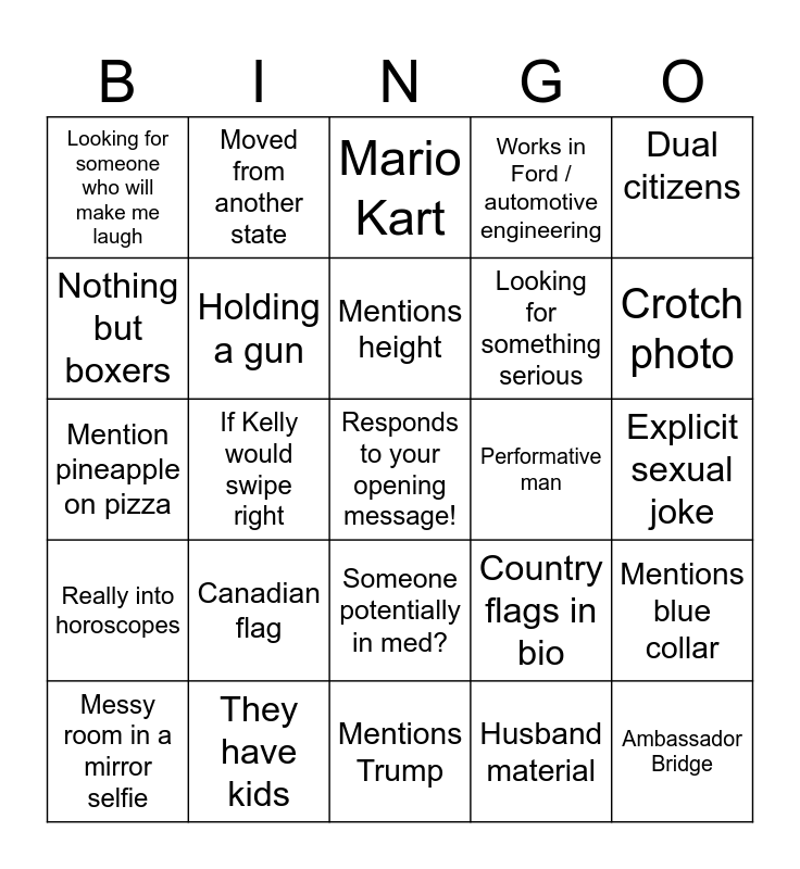 This bingo card has a free space and 49 words: Detroit lions fan, Ambassador Bridge, Holding a fish, Mentions Trump, Canadian flag, Gym mirror selfie, Moved from another state, ENM/non-monogamy or “open to exploring”, Nothing but boxers, From a township in Michigan, Holding a gun, Works in Ford / automotive engineering, Mentions blue collar, Country flags in bio, Marathon or running, Prompt that makes the gang laugh, Mentions height, Performative man, Tortoiseshell glasses, Dual citizens, If Kelly would swipe right, Husband material, Looking for someone who will make me laugh, Looking for something serious, Urinal/toilet, Crotch photo, Messy room in a mirror selfie, Photo of them and their cat, Someone potentially in med?, Really into horoscopes, Group photo as first profile pic (bonus points if you pick the right person), Single letter profile name, Someone we know pops up, Video of them working out, They have kids, Social smoker when drinking, Someone lying about their age (Oops! I can’t change it!), Algorithm pops someone up >1500 km away, Explicit sexual joke, Ambassador bridge, UWindsor student, Photo of them vaping, Photo of them with their mom, Founder/entrepreneuer, Mention pineapple on pizza, Mario Kart, Ice cream as an interest, TikTok audio reference and Bio is just emojis.