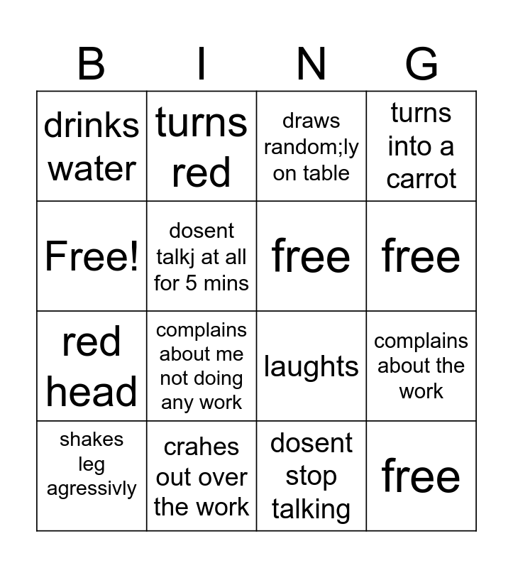 This bingo card has 16 words: crahes out over the work, complains about the work, draws random;ly on table, drinks water, red head, turns red, laughts, dosent stop talking, Free!, dosent talkj at all for 5 mins, shakes leg agressivly, turns into a carrot, complains about me not doing any work, free, free and free.