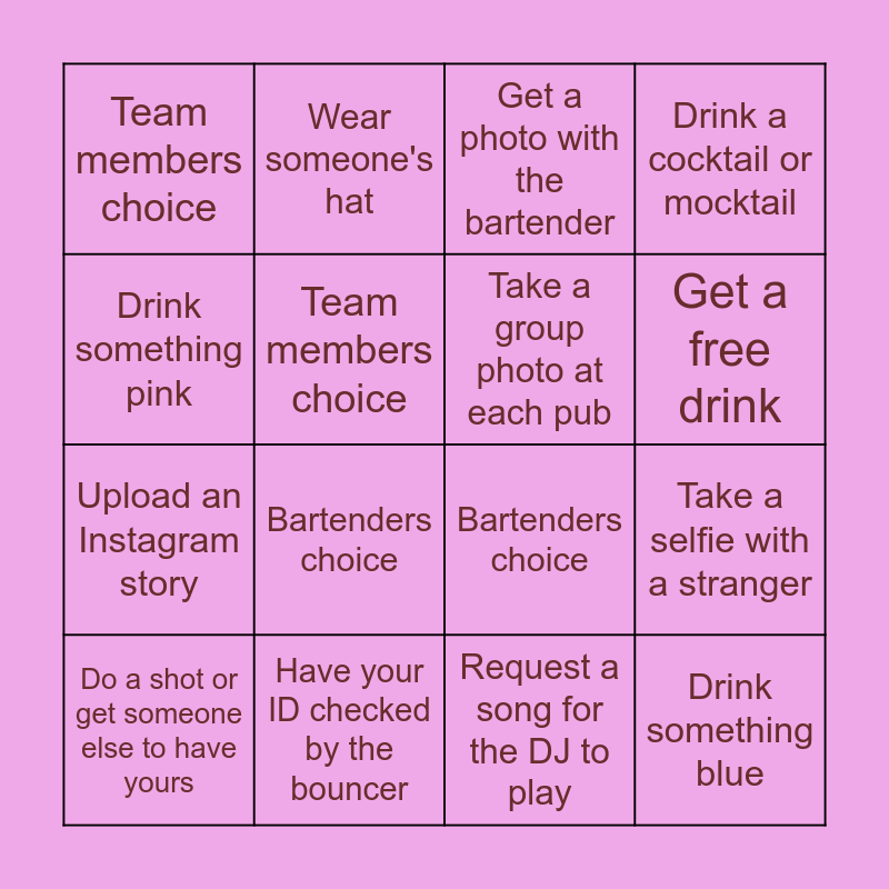 This bingo card has 16 words: Have your ID checked by the bouncer, Take a selfie with a stranger, Get a photo with the bartender, Team members choice, Upload an Instagram story, Wear someone's hat, Bartenders choice, Request a song for the DJ to play, Drink something pink, Team members choice, Do a shot or get someone else to have yours, Drink a cocktail or mocktail, Bartenders choice, Get a free drink, Take a group photo at each pub and Drink something blue.