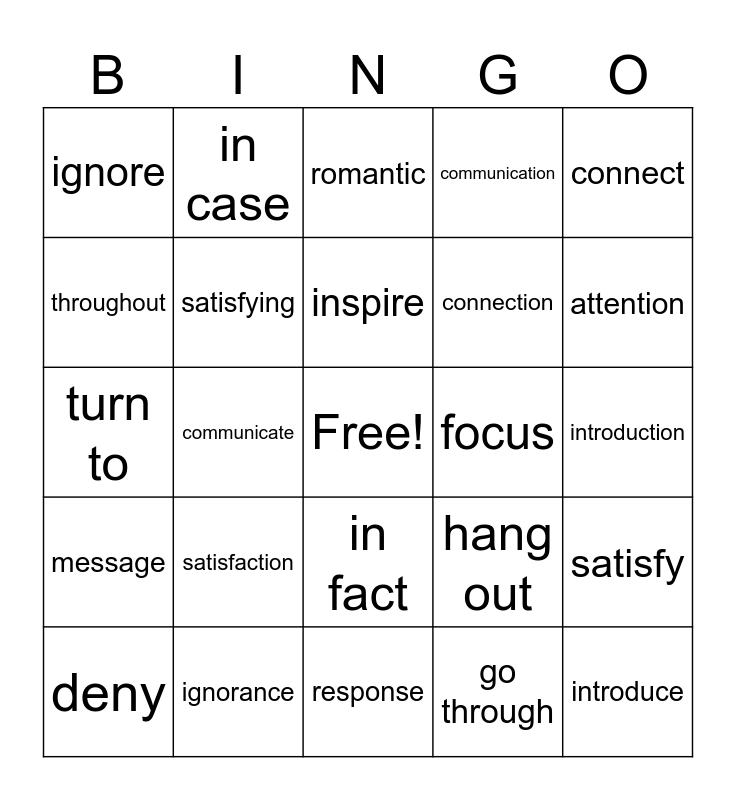 This bingo card has a free space and 38 words: relationship, relation, relate, satisfying, satisfy, satisfaction, inspire, inspiration, connect, connection, communicate, communication, introduce, introduction, throughout, message, refresh, romantic, romance, focus, ignore, ignorance, attention, deny, respond, response, disappointed, disappoint, disappointment, personally, personal, in fact, go through, in case, in addition, hang out, turn to and take...personally.
