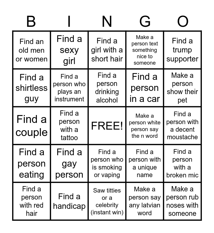This bingo card has a free space and 24 words: Find a gay person, Find a handicap, Find a person drinking alcohol, Find a person with red hair, Find a trump supporter, Find an old men or women, Find a shirtless guy, Find a sexy girl, Make a person white person say the n word, Find a person who is smoking or vaping, Find a person in a car, Find a couple, Find a person with a unique name, Find a person with a broken mic, Find a person who plays an instrument, Make a person say any latvian word, Find a person with a decent moustache, Find a girl with a short hair, Make a person show their pet, Find a person with a tattoo, Make a person rub noses with someone, Find a person eating, Make a person text something nice to someone and Saw titties or a celebrity (instant win).