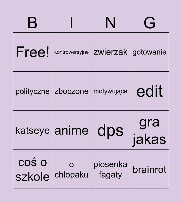 This bingo card has 16 words: coś o szkole, o chlopaku, zwierzak, gotowanie, polityczne, kontrowersyjne, dps, gra jakas, Free!, zboczone, piosenka fagaty, edit, katseye, anime, motywujące and brainrot.