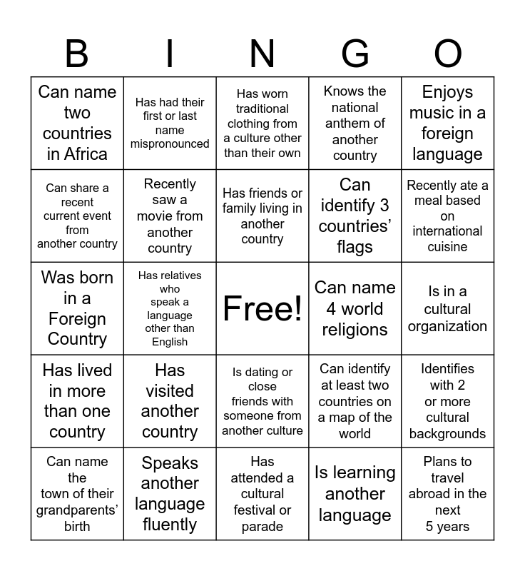 This bingo card has a free space and 24 words: Has visited another country, Speaks another language fluently, Has friends or family living in another country, Can name the town of their grandparents’ birth, Enjoys music in a foreign language, Can name two countries in Africa, Can share a recent current event from another country, Has had their first or last name mispronounced, Can name 4 world religions, Is dating or close friends with someone from another culture, Can identify 3 countries’ flags, Was born in a Foreign Country, Can identify at least two countries on a map of the world, Identifies with 2 or more cultural backgrounds, Recently saw a movie from another country, Is learning another language, Is in a cultural organization, Has worn traditional clothing from a culture other than their own, Recently ate a meal based on international cuisine, Has relatives who speak a language other than English, Plans to travel abroad in the next 5 years, Has lived in more than one country, Knows the national anthem of another country and Has attended a cultural festival or parade.